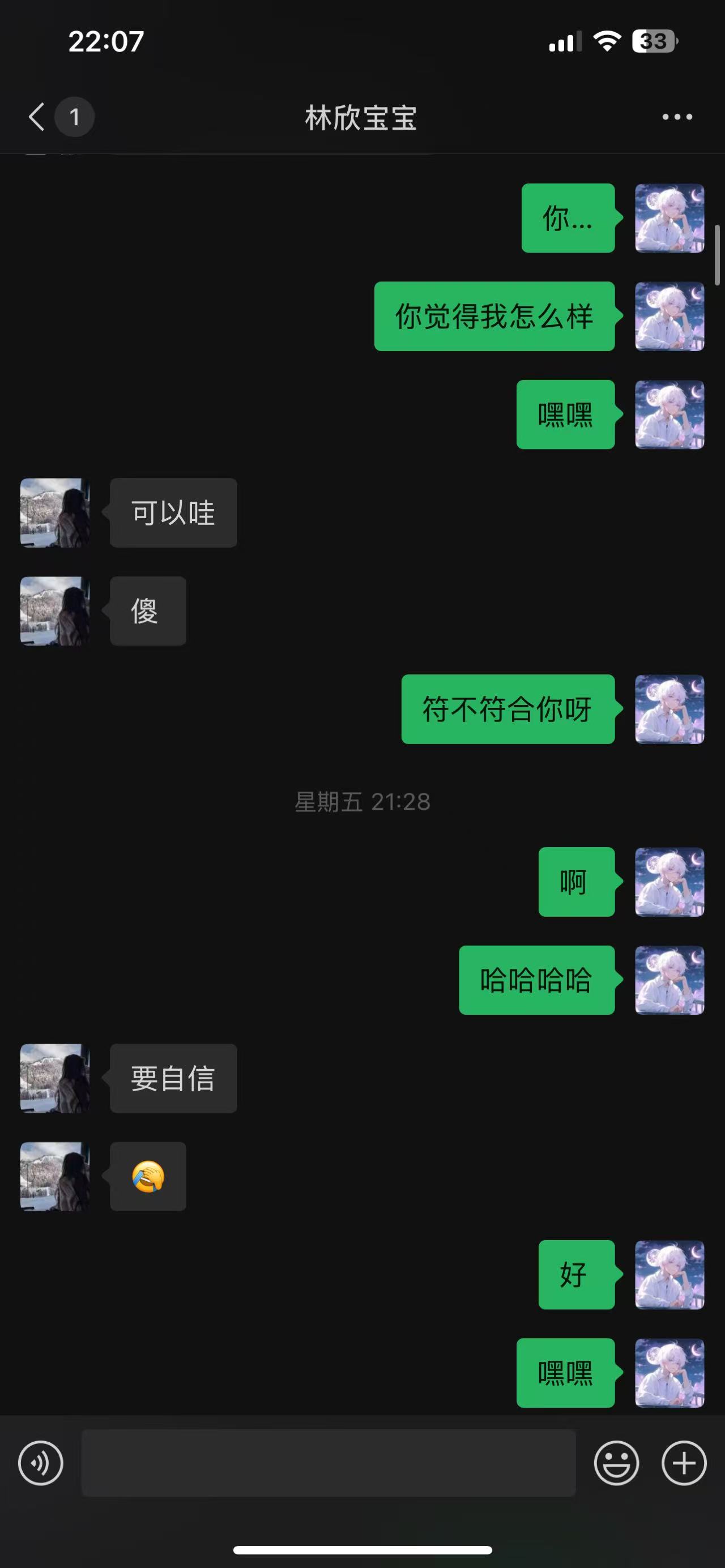 我慢慢的进入了她的工作地点,随后我看到了她,在这一刻我第一眼就认出来了她,她也是,随后她面带微笑的问我要吃什么,我当时紧张的说不出话来哈哈哈哈哈,随后我一直看着她,时不时就往后望过去,真的,我见到她之后,我很想跟她去牵手,但又害怕她看不上我,不喜欢我,但最后你的一句“可以哇,傻,要自信”让我开心了起来,最后我就在那里吃完了饭,然后就“先行离开”了,但可惜最后没有牵手,只有你摸了一下我的脸嘿嘿。